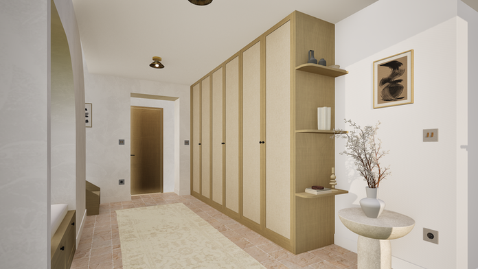 Une entrée fonctionnelle, avec banquette, grand tiroir à chaussures, rangements toute hauteur